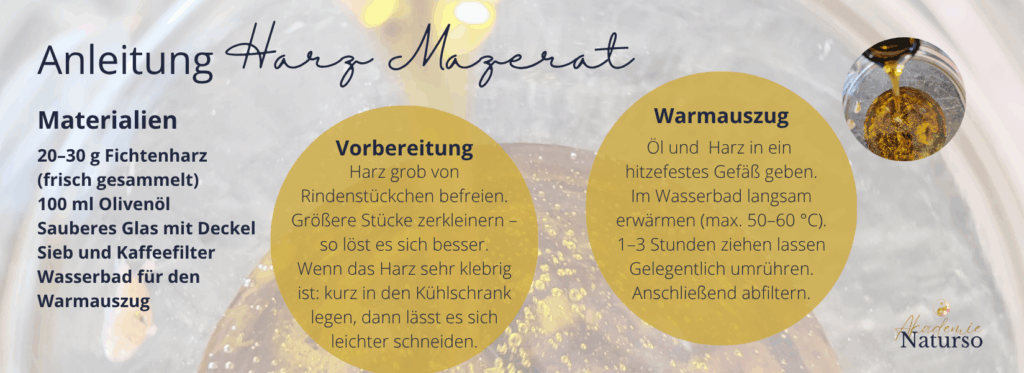 Die Bäume bergen in dieser Jahreszeit kleine Schätze: glänzende Harztropfen, die in der Sonne bernsteinfarben leuchten. Diese Harze können gesammelt und in einem hochwertigen Pflanzenöl eingelegt werden – so entsteht ein Mazerat, das nach einigen Wochen zu einem duftenden Erkältungs- & Muskel-Relax-Öl weiterverarbeitet werden kann.