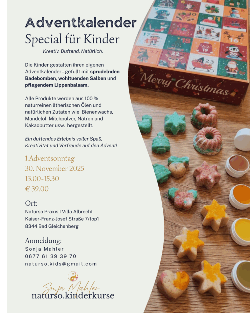 Besonders ans Herz legen möchte ich euch den 1. Advent, an dem Kinder in meinem Kurs ihren eigenen Adventkalender mit selbstgerührten, schäumenden Badebomben herstellen dürfen – ein duftendes, kreatives Erlebnis für kleine Hände und große Herzen. 💫