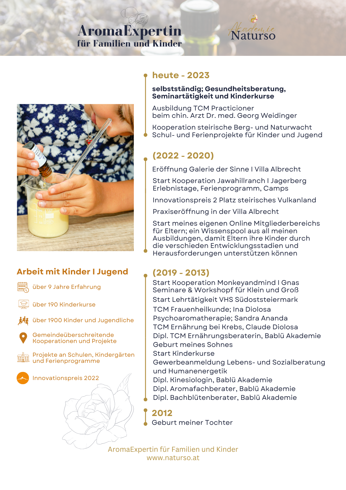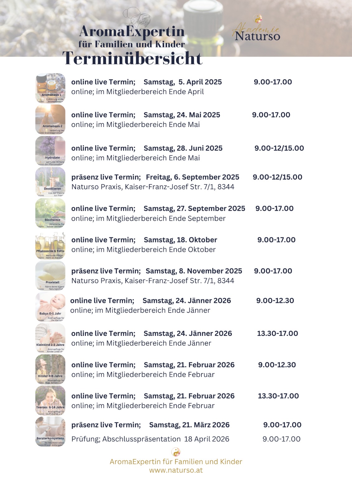 Dieses Modul ist Teil der Ausbildung zur AromaExpertin für Familien und Kinder und wird vollständig auf die Gesamtausbildung angerechnet.
